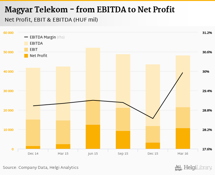 Magyar Telekom made a net profit of HUF 10,715 mil with revenues of HUF 145,051 mil in 1Q2016, up by 220% and down by 20.7%, respectively, compared to the previous year. This translates into a net margin of 5.57%.