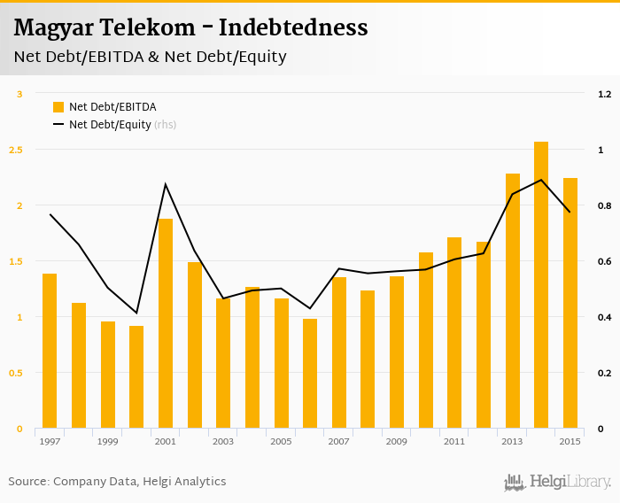 Magyar Telekom's net debt stood at HUF 420,445 mil and accounted for 0.772 of equity at the end of 2015. The ratio is down 0.117 pp compared to the previous year.