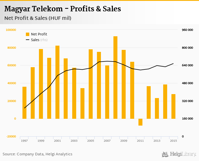 Magyar Telekom made a net profit of HUF 27,715 mil in 2015, down 28.2% compared to the previous year. Total sales reached HUF 656,342 mil, which is up 4.77% when compared to the previous year.