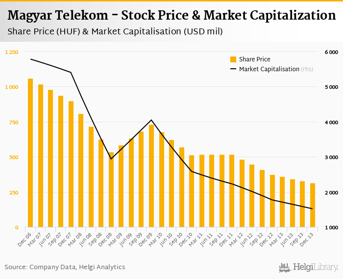 Magyar Telekom stock traded at HUF 314 per share at the end 4Q2013 implying a market capitalization of USD 1,518 mil.