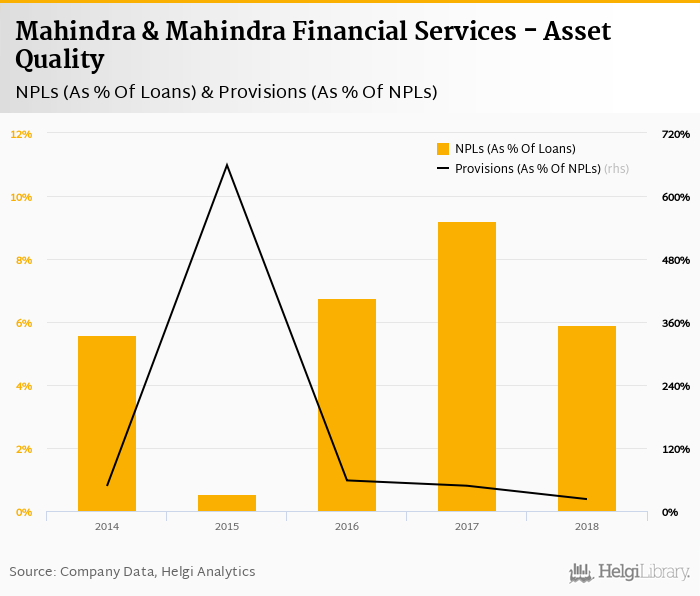 Mahindra & Mahindra Financial Services's non-performing loans reached 5.90% of total loans at the end of 2018, down from 9.21% compared to the previous year. Historically, the NPL ratio hit an all time high of 9.21% in 2017 and an all time low of 0.540% in 2015.