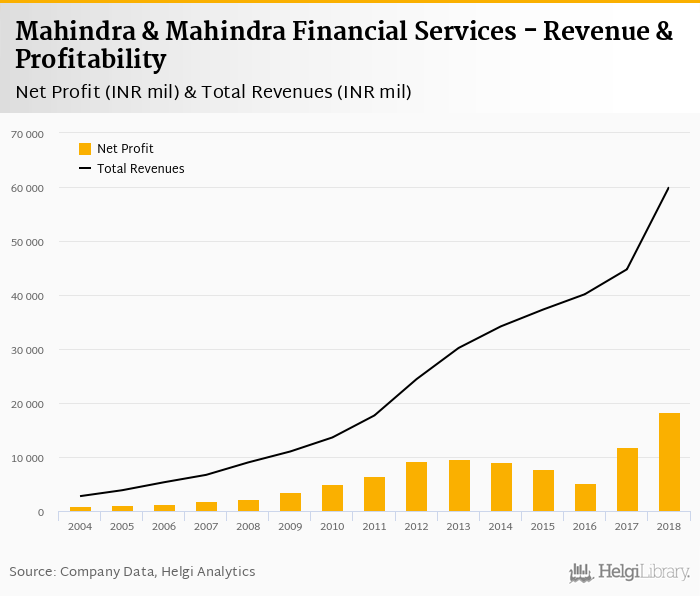 Mahindra & Mahindra Financial Services made a net profit of INR 18,273 mil under revenues of INR 59,978 mil in 2018, up 54.2% and 34.0% respectively compared to the previous year.