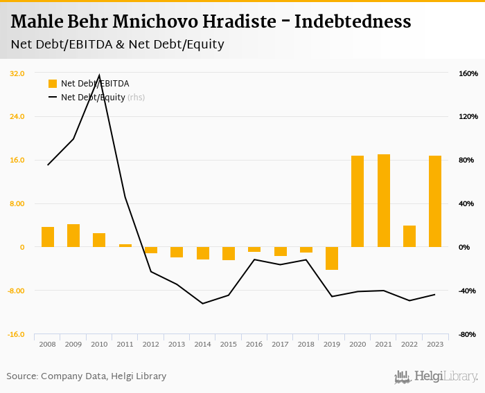 Mahle Behr Mnichovo Hradiste's net debt stood at CZK -968 mil and accounted for -44.1% of equity at the end of 2023. The ratio is up 5.69 pp compared to the previous year.
