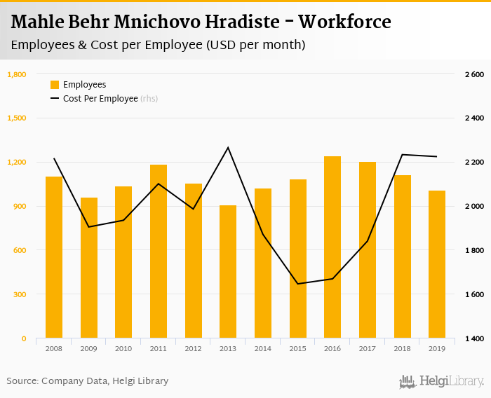 Mahle Behr Mnichovo Hradiste employed 1,008 employees in 2019, down 9.43% compared to the previous year. Historically, between 2008 and 2019, the firm's workforce hit a high of 1,241 employees in 2016 and a low of 909 employees in 2013.