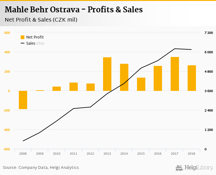Mahle Behr Ostrava made a net profit of CZK 262 mil in 2018, down 25% compared to the previous year. Total sales reached CZK 6,138 mil, which is down 0.817% when compared to the previous year.