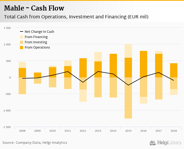 Mahle's operating cash flow stood at EUR 432 mil in 2018, down 39.3% when compared to the previous year. Historically, between 2008 - 2018, the firm’s operating cash flow reached a high of EUR 801 mil in 2016 and a low of EUR 141 mil in 2009.