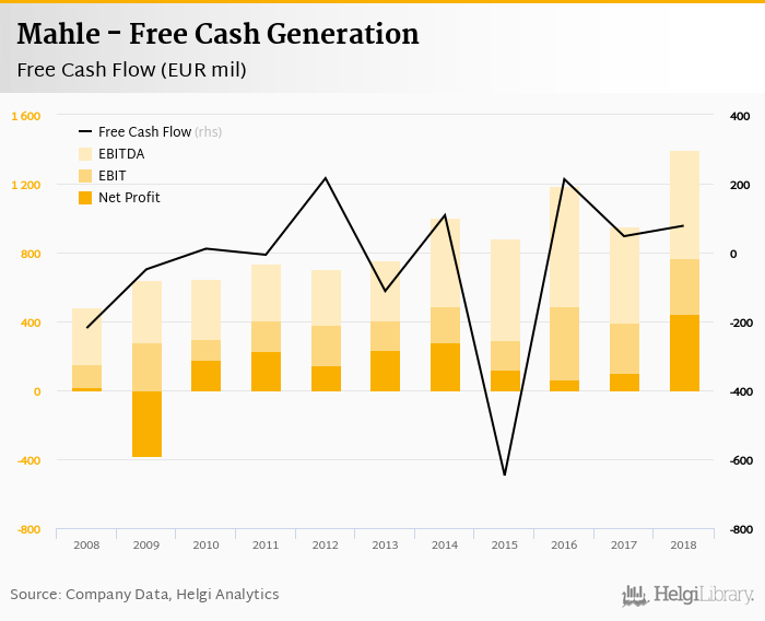 Mahle made a net profit of EUR 446 mil with revenues of EUR 12,581 mil in 2018, up by 337% and down by 1.62%, respectively, compared to the previous year. This translates into a net margin of 3.55%.