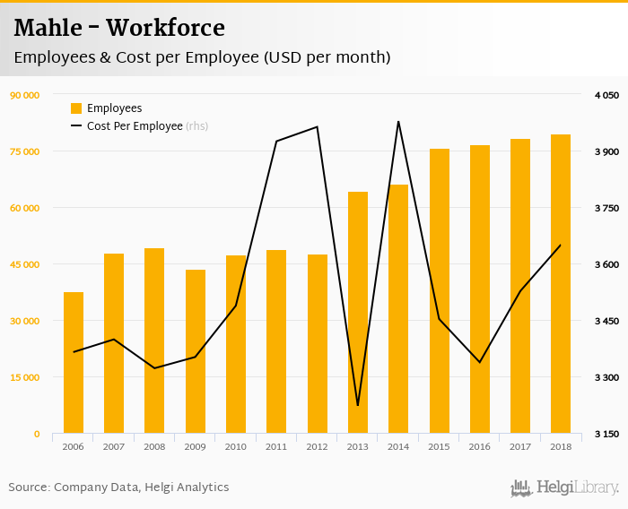Mahle employed 79,564 employees in 2018, up 1.64% compared to the previous year. Historically, between 2006 and 2018, the firm's workforce hit a high of 79,564 employees in 2018 and a low of 37,566 employees in 2006.
