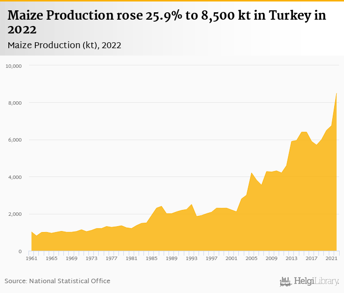 Maize production rose 25.9% to 8,500 kt in Turkey in 2022, according to Faostat.