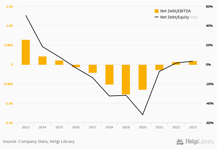 Historically, the firm’s net debt to equity reached a high of 50.7% in 2013 and a low of -52.0% in 2020 between 2013 and 2023. The average for the last five years was -17.3%.