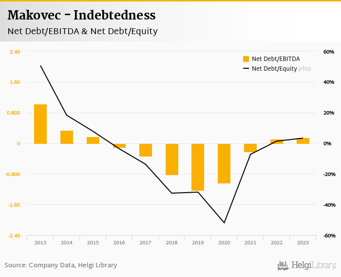 Makovec's net debt stood at CZK 14.1 mil and accounted for 3.26% of equity at the end of 2023. The ratio is up 1.93 pp compared to the previous year.