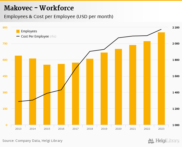 Makovec employed 855 employees in 2023, up 10.6% compared to the previous year. Historically, between 2013 and 2023, the firm's workforce hit a high of 855 employees in 2023 and a low of 557 employees in 2015.