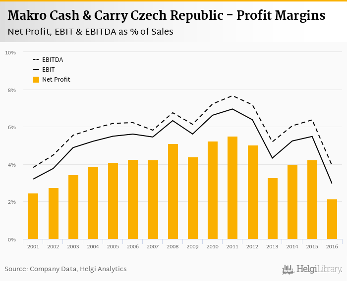 Makro Cash & Carry Czech Republic made a net profit of CZK 637 mil with revenues of CZK 29,895 mil in 2016, down by 50.1% and down by 0.762%, respectively, compared to the previous year.