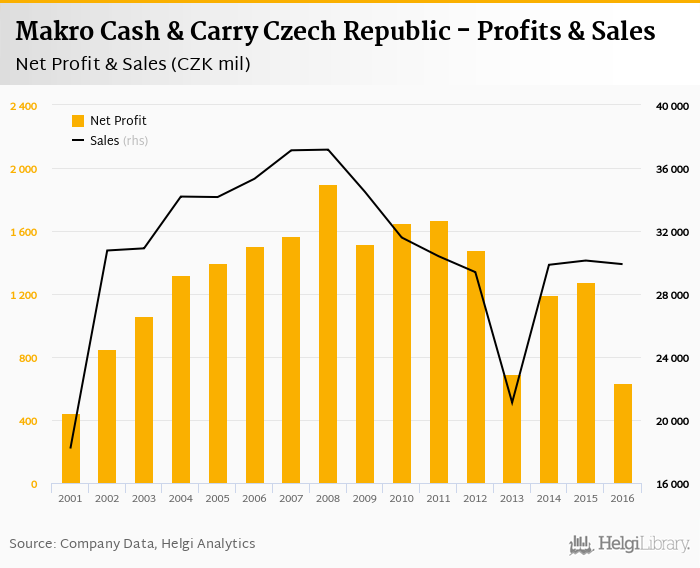 Makro Cash & Carry Czech Republic made a net profit of CZK 637 mil in 2016, down 50.1% compared to the previous year. Total sales reached CZK 29,895 mil, which is down 0.762% when compared to the previous year.