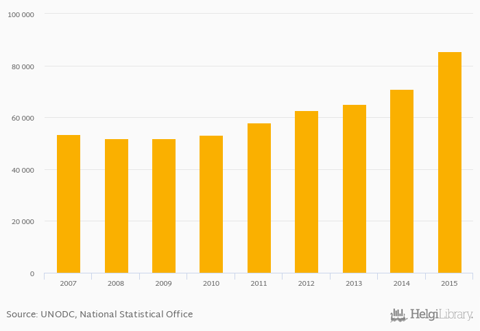 Male adults held in prisons, penal or correctional institutions rose 20.6% to 85,576 persons in Philippines in 2015, according to the United Nations.