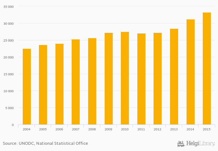 Male adults held in prisons, penal or correctional institutions rose 6.59% to 33,256 persons in Australia in 2015, according to the United Nations.