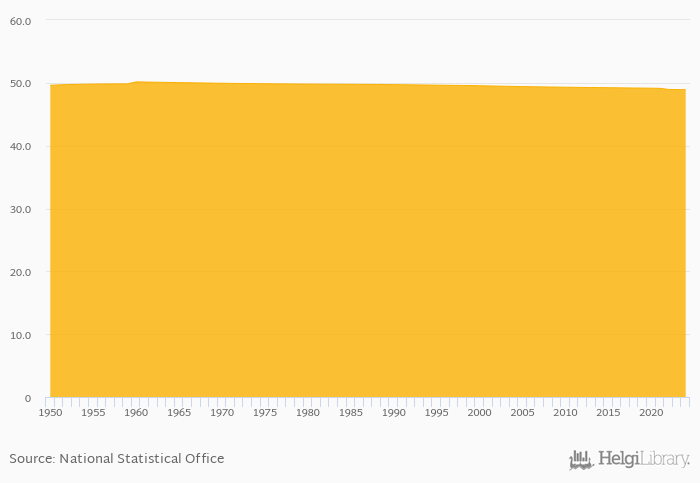 Male population as a percentage of total population fell 0.049% to 48.9% in Brazil in 2024, according to the National Statistical Office.