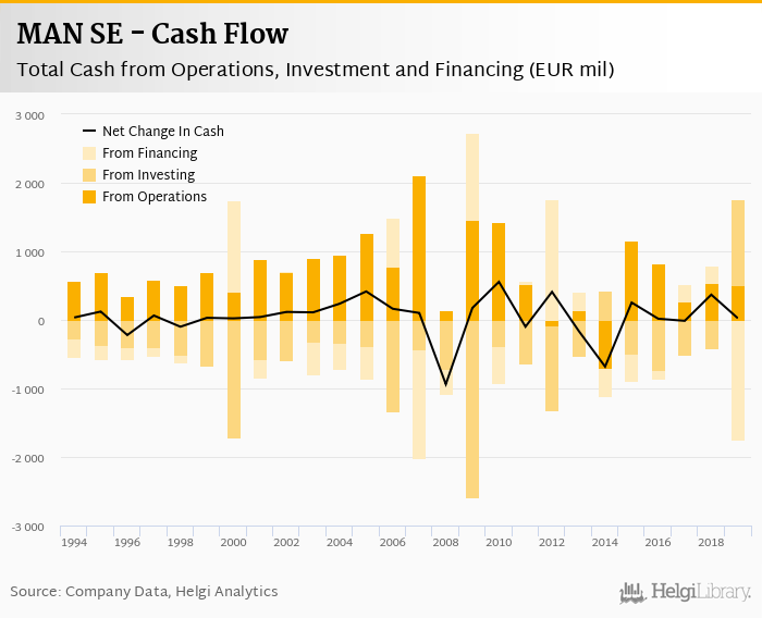 MAN SE's operating cash flow stood at EUR 515 mil in 2019, down 5.5% when compared to the previous year. Historically, between 1994 - 2019, the firm’s operating cash flow reached a high of EUR 2,109 mil in 2007 and a low of EUR -695 mil in 2014.