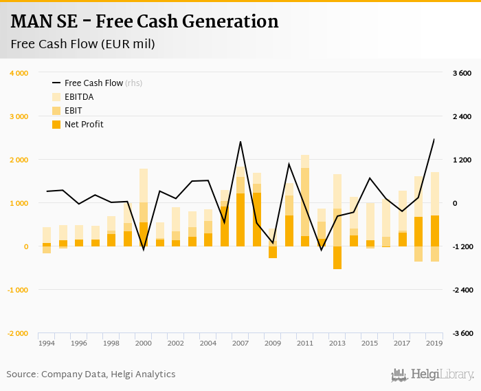 MAN SE made a net profit of EUR 712 mil with revenues of EUR 12,663 mil in 2019, up by 5.48% and up by 4.62%, respectively, compared to the previous year. This translates into a net margin of 5.62%.
