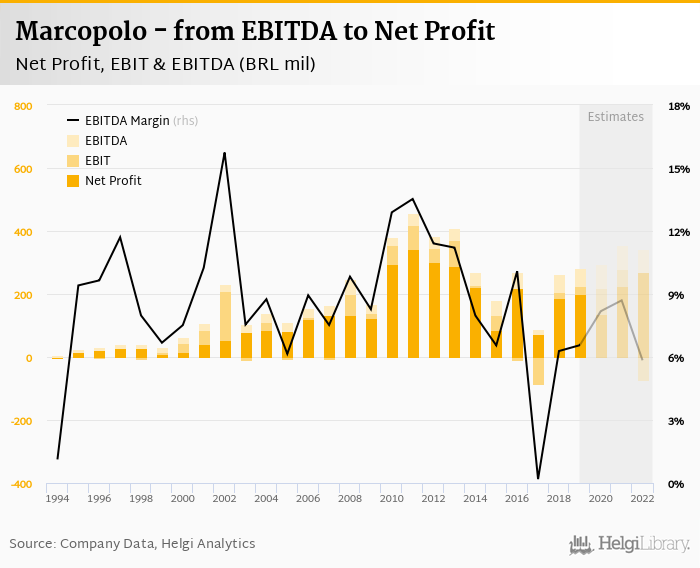 Marcopolo made a net profit of BRL 201 mil with revenues of BRL 4,315 mil in 2019, up by 7.85% and up by 2.79%, respectively, compared to the previous year. This translates into a net margin of 4.67%.