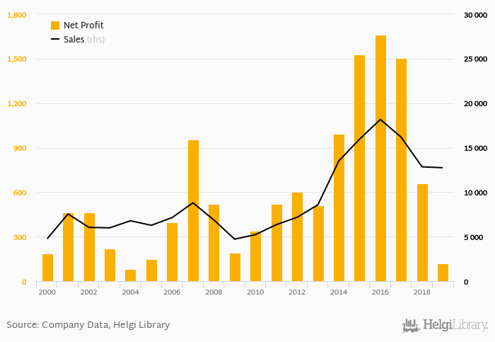 Historically, between 2000 and 2019, the company’s net profit reached a high of CZK 1,660 mil in 2016 and a low of CZK 81.2 mil in 2004. Over the last decade the firm's net profit decreased by an average of 4.56% a year.