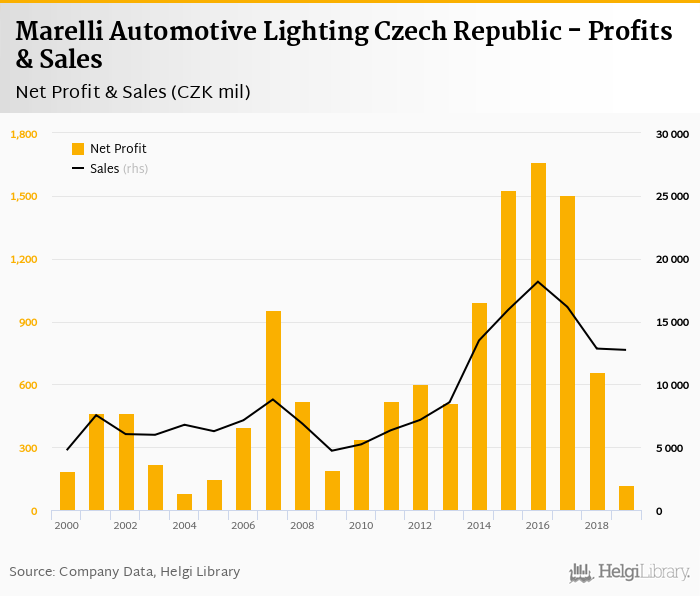 Marelli Automotive Lighting Czech Republic made a net profit of CZK 121 mil in 2019, down 81.8% compared to the previous year. Total sales reached CZK 12,741 mil, which is down 0.8080000000000001% when compared to the previous year.