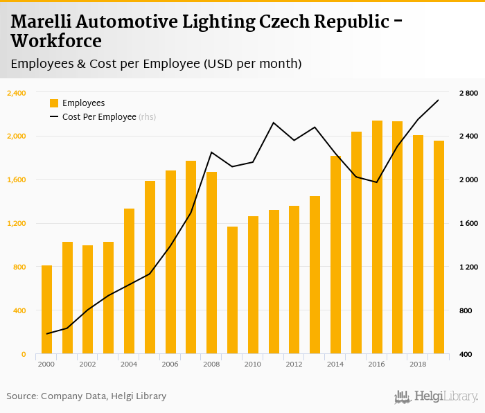 Marelli Automotive Lighting Czech Republic employed 1,959 employees in 2019, down 2.73% compared to the previous year. Historically, between 2000 and 2019, the firm's workforce hit a high of 2,147 employees in 2016 and a low of 816 employees in 2000.