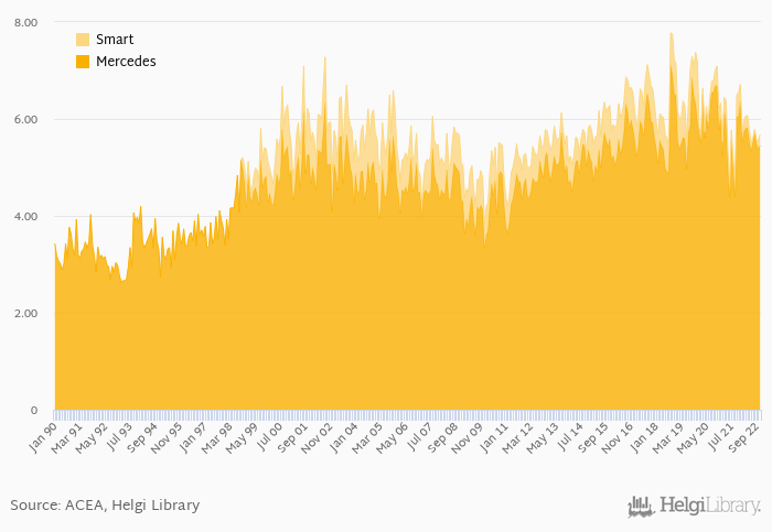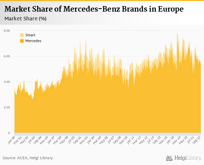 Mercedes-Benz sold 57.6 thousand new passenger cars representing a 5.68% share of all new passenger cars sold in Europe in November 2022. This is 2.05% more vehicles and a 0.856 pp decrease in market share when compared to last year. By comparison, three years ago, Mercedes-Benz's market share was 7.37%.