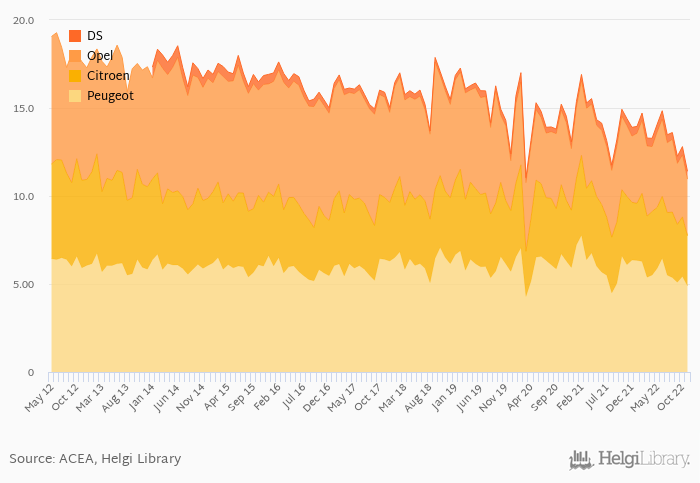 The Group sold 49.7 thousand of Peugeots cars, followed by 32.6 thousand of Opels and 29.0 thousand of Citroens in November 2022.