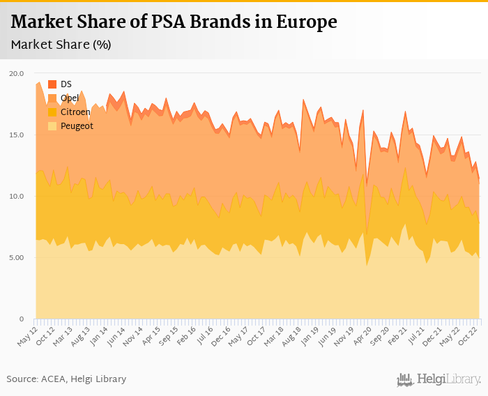 PSA Group sold 116 thousand new passenger cars representing a 11.4% share of all new passenger cars sold in Europe in November 2022. This is 6.99% fewer vehicles and a 2.99 pp decrease in market share when compared to last year. By comparison, the market share three years ago stood at 14.3% and is down by 2.90 pp now.