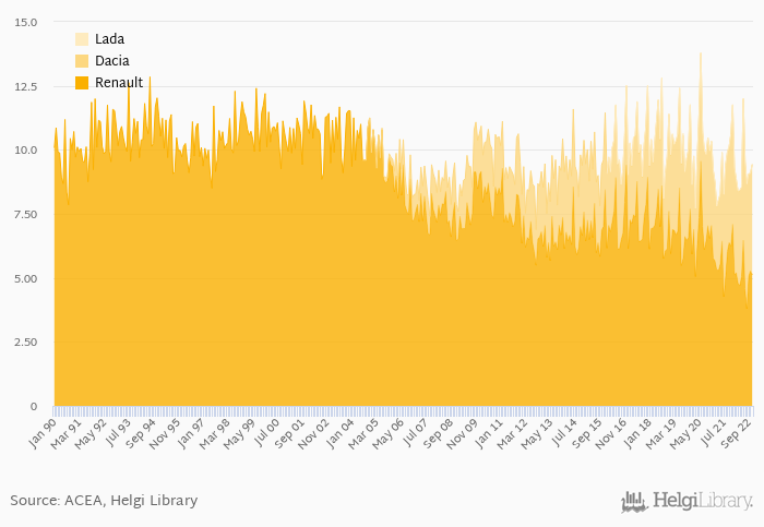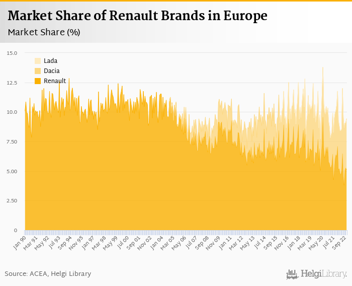 Renault Group sold 96.0 thousand new passenger cars representing a 9.46% share of all new passenger cars sold in Europe in November 2022. This is 4.24% more vehicles and a 1.20 pp decrease in market share when compared to last year. By comparison, three years ago, Renault Group's market share was 10.0%.