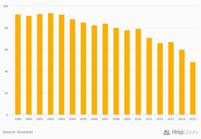 Historically, market share of the largest electricity generator in Belgium reached an all time high of 93.4% in 2002 and an all time low of 48.5% in 2015.