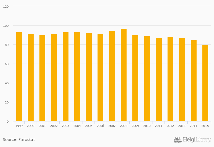 Historically, market share of the largest electricity generator in Estonia reached an all time high of 96.5% in 2008 and an all time low of 79.8% in 2015.