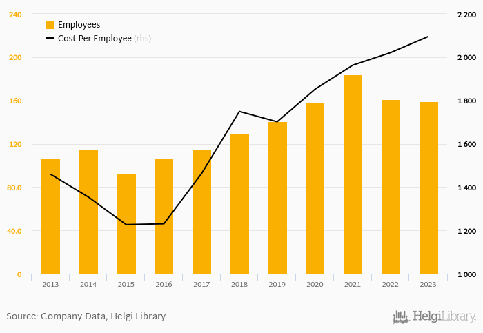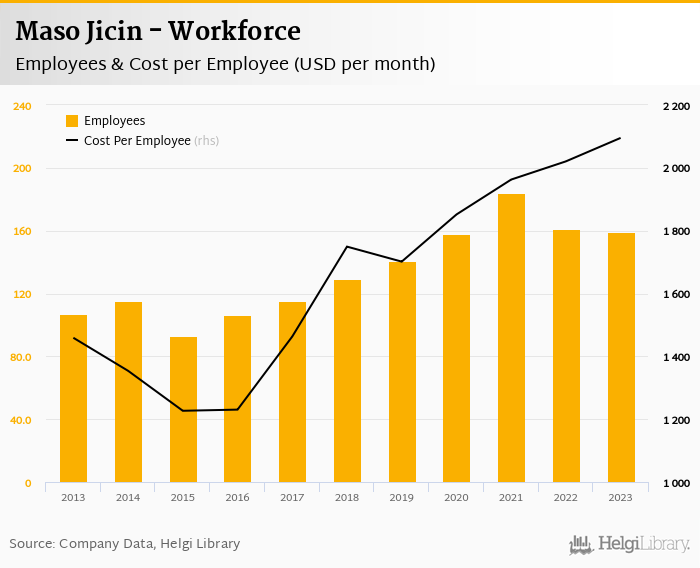 Maso Jicin employed 159 employees in 2023, down 1.24% compared to the previous year. Historically, between 2013 and 2023, the firm's workforce hit a high of 184 employees in 2021 and a low of 93.0 employees in 2015.