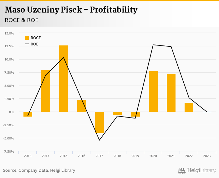 Maso Uzeniny Pisek made a net profit of CZK -0.176 mil in 2023, down 102% compared to the previous year. Historically, between 2013 and 2023, the company's net profit reached a high of CZK 51.2 mil in 2020 and a low of CZK -24.0 mil in 2017.