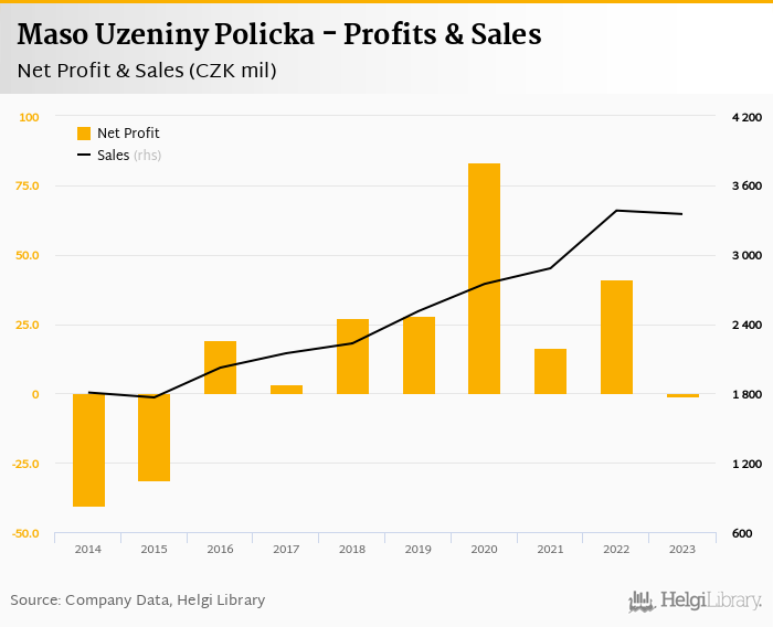 Maso Uzeniny Policka made a net profit of CZK -0.960 mil in 2023, down 102% compared to the previous year. Total sales reached CZK 3,351 mil, which is down 0.895% when compared to the previous year.