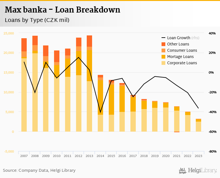 Max banka's loans reached CZK 3,242 mil in the 2023, down from CZK 5,116 mil compared to the previous year. Historically, the bank’s loans reached an all time high of CZK 24,442 mil in 2013 and an all time low of CZK 3,242 mil in 2023.