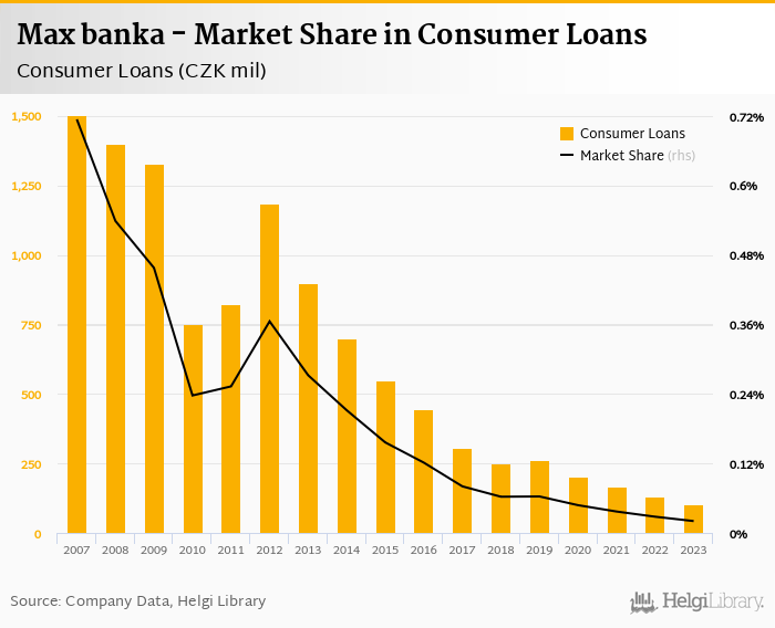 Max banka accounted for 0.020% of all consumer loans issued in Czechia at the end of 2023. Historically, the bank’s market share in consumer loans reached an all time high of 0.714% in 2007 and an all time low of 0.020% in 2023.