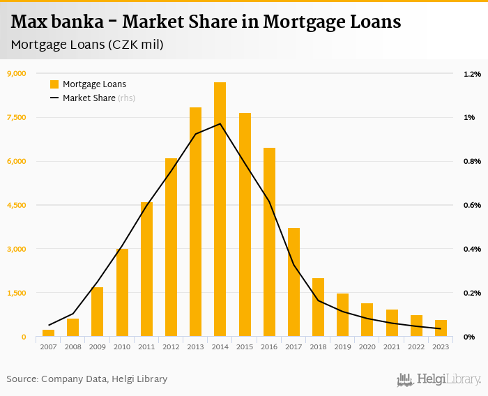 Max banka accounted for 0.033% of all mortgage loans issued in Czechia at the end of 2023. Historically, the bank’s market share in mortgage loans reached an all time high of 0.969% in 2014 and an all time low of 0.033% in 2023.