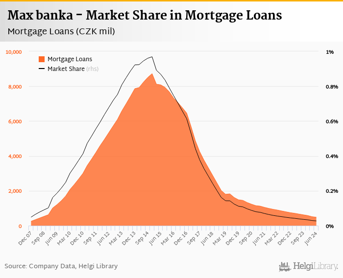 Max banka accounted for 0.027% of all mortgage loans issued in Czechia at the end of 2Q2024. Historically, the bank’s market share in mortgage loans reached an all time high of 0.969% in 4Q2014 and an all time low of 0.027% in 2Q2024.