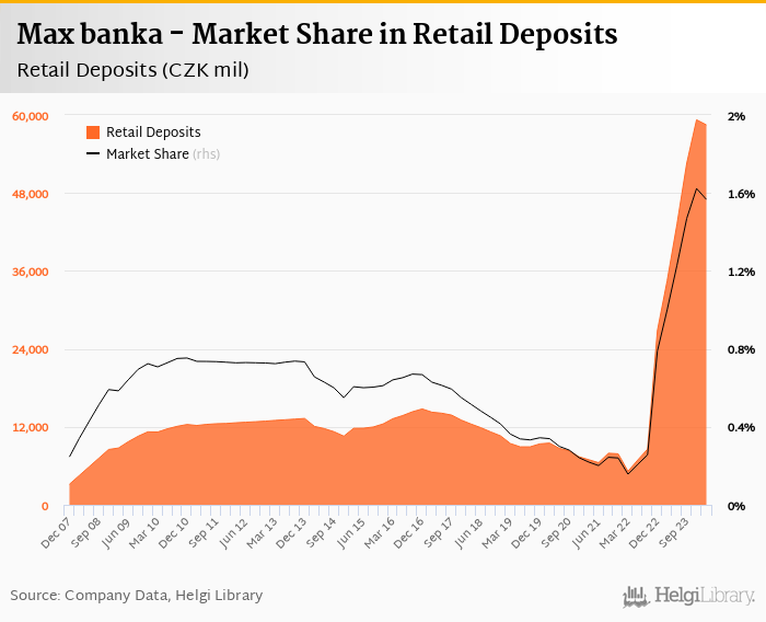 Max banka accounted for 1.57% of all retail deposits taken by banks in Czechia at the end of 2024-03-31. Historically, the bank’s market share in retail deposits reached an all time high of 1.62% in 2023-12-31 and an all time low of 0.157% in 2022-03-31.
