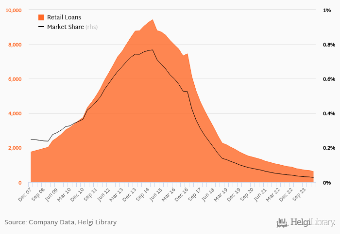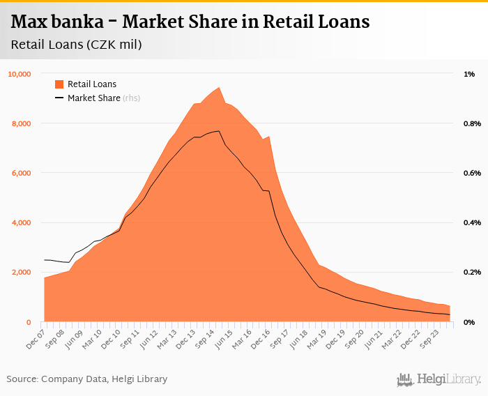 Max banka accounted for 0.027% of all retail loans issued in Czechia at the end of 1Q2024. Historically, the bank’s market share in retail loans reached an all time high of 0.767% in 4Q2014 and an all time low of 0.027% in 1Q2024.