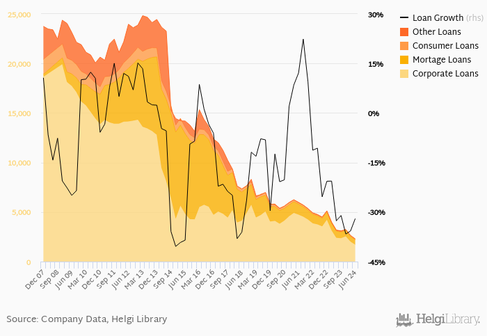 Mortgage loans represented 21.0% of the bank's loan book at the end of the year 2Q2024, consumer further 4.02% and corporate loans 75.0% of total loans.