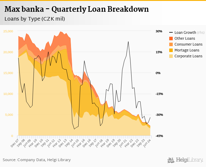 Max banka's loans reached CZK 2,293 mil in the second quarter of 2024, down from CZK 2,632 mil when compared to the previous quarter and down from CZK 3,153 mil when compared to the same period of last year. Historically, the bank’s loans reached an all time high of CZK 24,819 mil in 1Q2013 and an all time low of CZK 2,293 mil in 2Q2024.
