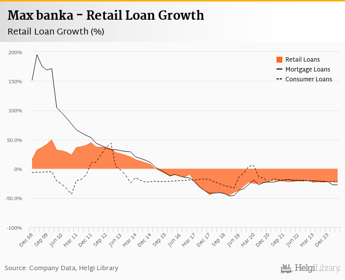 Max banka's retail loans reached CZK 574 mil at the end of 2024-06-30, down 6.11% compared to the previous year. In the last decade, the average annual loan growth amounted to -24.1%.