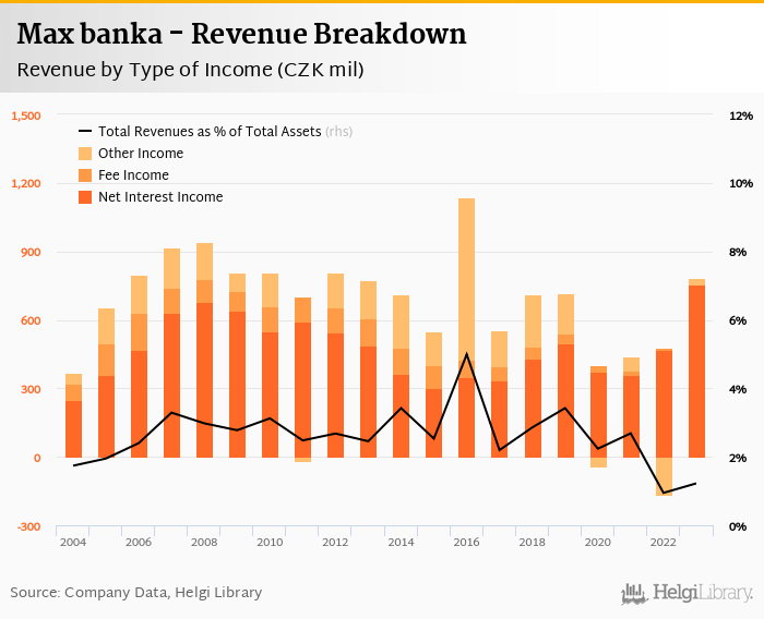 Max banka generated total banking revenues of CZK 782 mil in 2023, up 150% compared to the previous year.