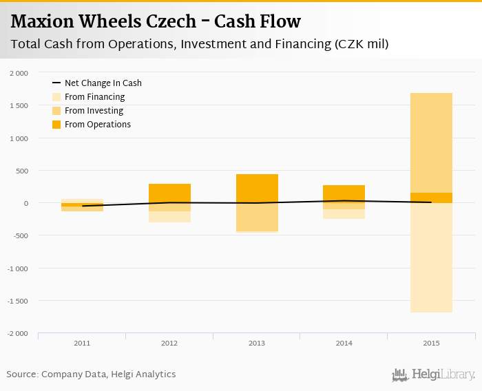 Cash from financing amounted to CZK -1,688 mil, so the company generated CZK 0.335 mil net cash in 2015.