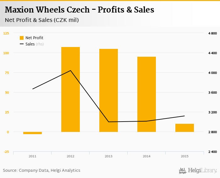Maxion Wheels Czech made a net profit of CZK 10.2 mil in 2015, down 89.3% compared to the previous year. Total sales reached CZK 3,118 mil, which is up 3.54% when compared to the previous year.