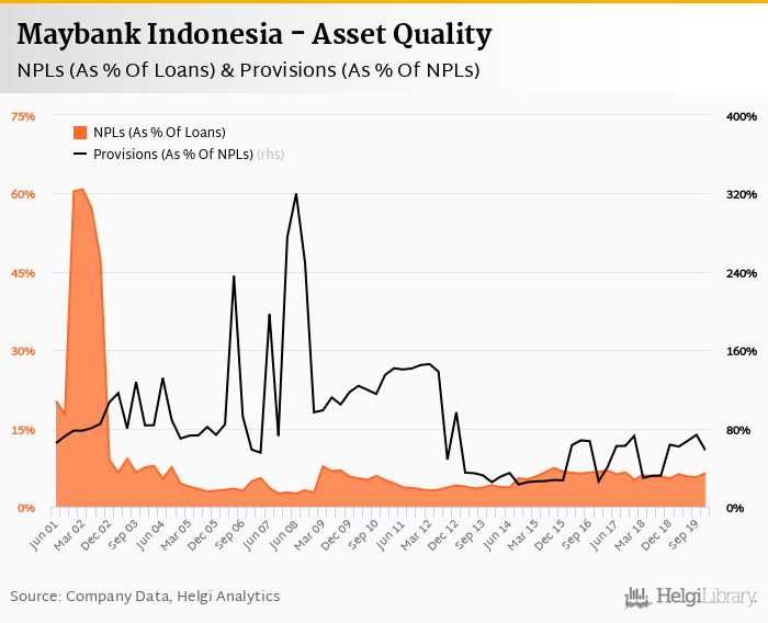 Maybank Indonesia's non-performing loans reached 6.45% of total loans at the end of 2019-12-31, up from 5.44% compared to the previous year. Historically, the NPL ratio hit an all time high of 60.8% in 2002-03-31 and an all time low of 2.49% in 2008-06-30.