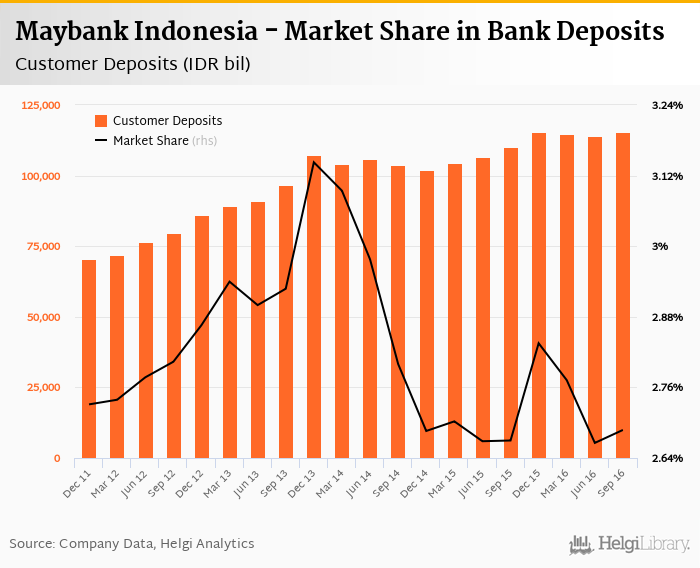 Maybank Indonesia accounted for 2.69% of all customer deposits taken by banks in Indonesia at the end of 2016-09-30. Historically, the bank’s market share in customer deposits reached an all time high of 3.14% in 2013-12-31 and an all time low of 2.67% in 2016-06-30.
